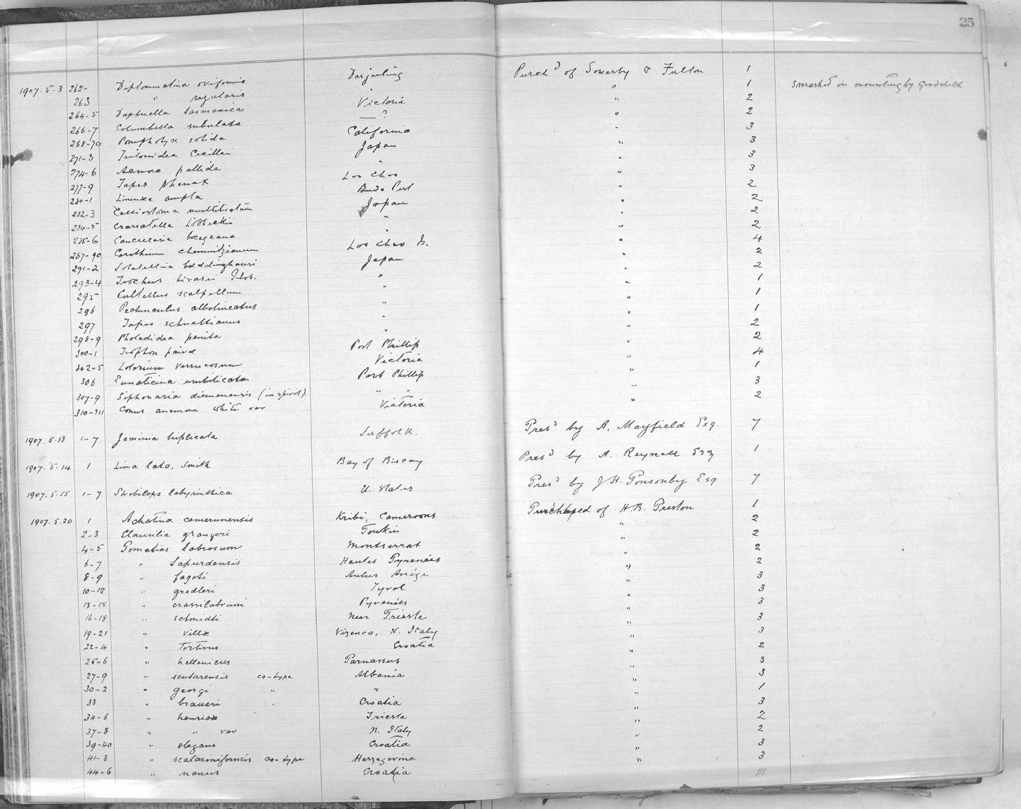 | Title | Zoology Accessions Register: Mollusca: 1906 - 1911: page 25 |